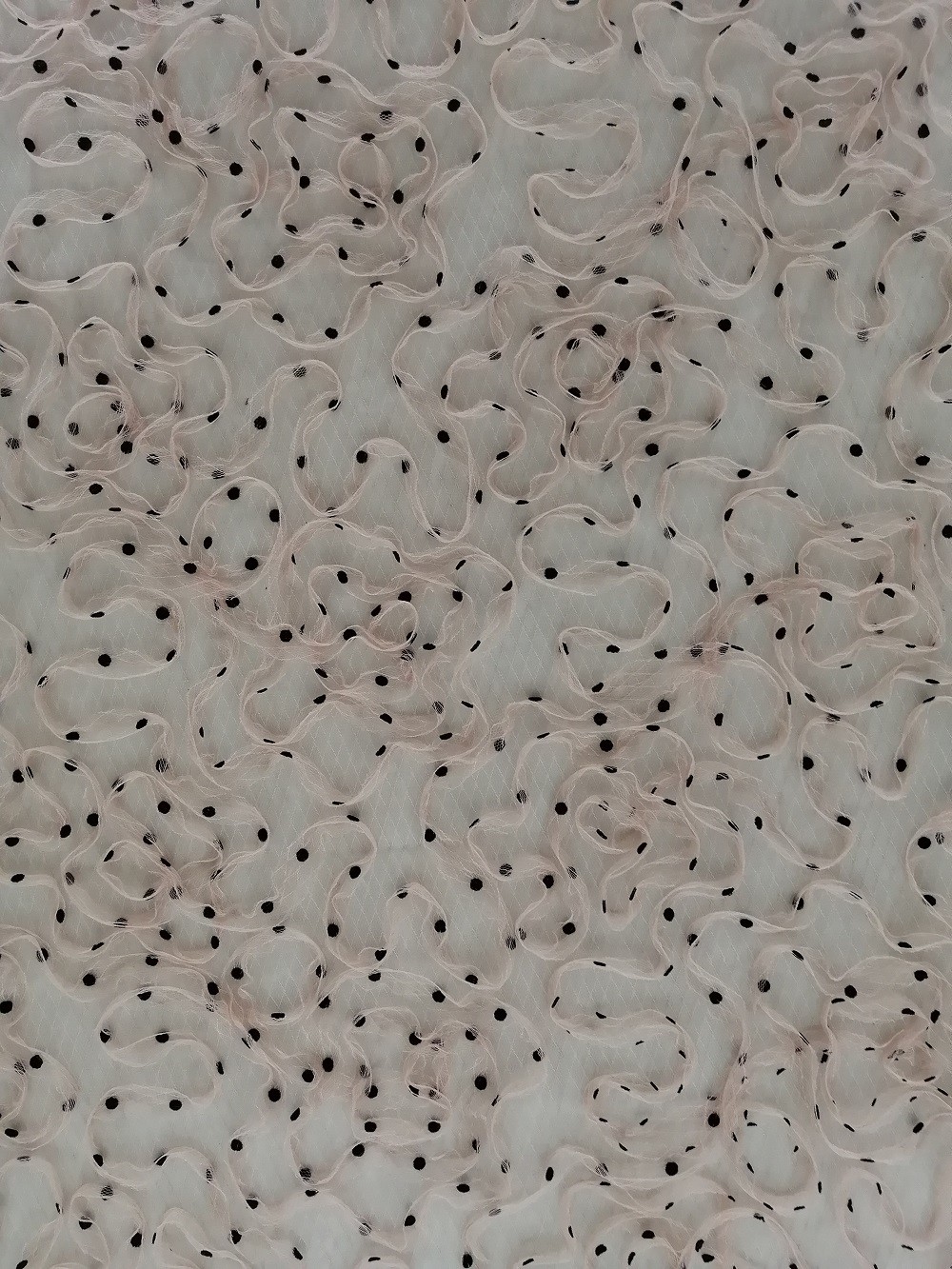 A. 레이스천, 끈 정비, 자수 원단, 얇은 명주 그물 망조직, 얇은 명주 그물 포일 구성, 얇은 명주 그물 프린팅 구성, 얇은 명주 그물 플로킹 구성, 얇은 명주 그물 번쩍이는 금속 조각 구성.