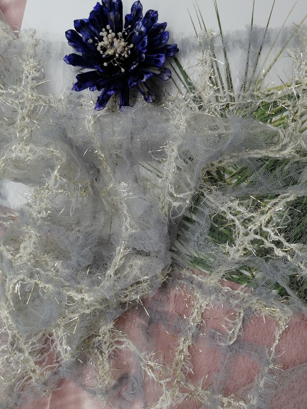 A. 레이스천, 끈 정비, 자수 원단, 얇은 명주 그물 망조직, 얇은 명주 그물 포일 구성, 얇은 명주 그물 프린팅 구성, 얇은 명주 그물 플로킹 구성, 얇은 명주 그물 번쩍이는 금속 조각 구성.