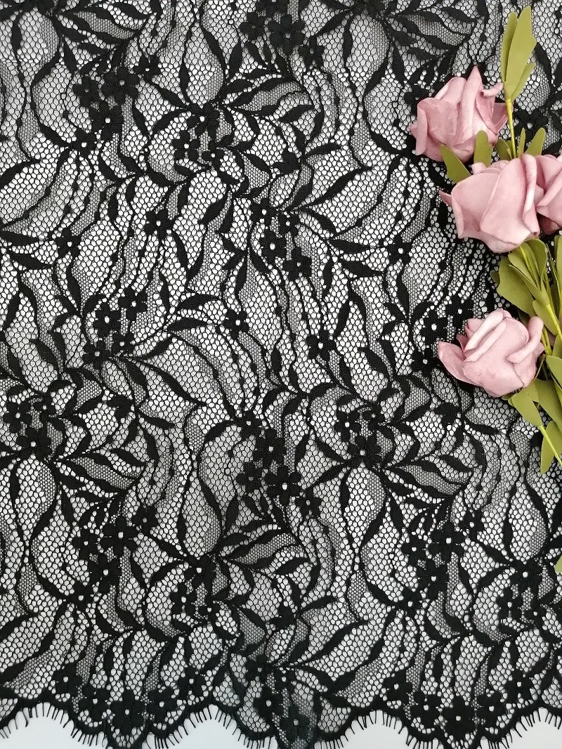 집이 훼브릭, 커튼, 베딩 품목, 의류, 모자, 웨딩 드레스, 블라우스, 기타 등등 여성 장기간 치마 드레스 의복 어린 소녀 드레스를 위한 무딘 톱날 모양과 검은 얇은 명주 그물 메쉬 프랑스 샹티 레이스 빛 레이스 속눈썹 레이스.