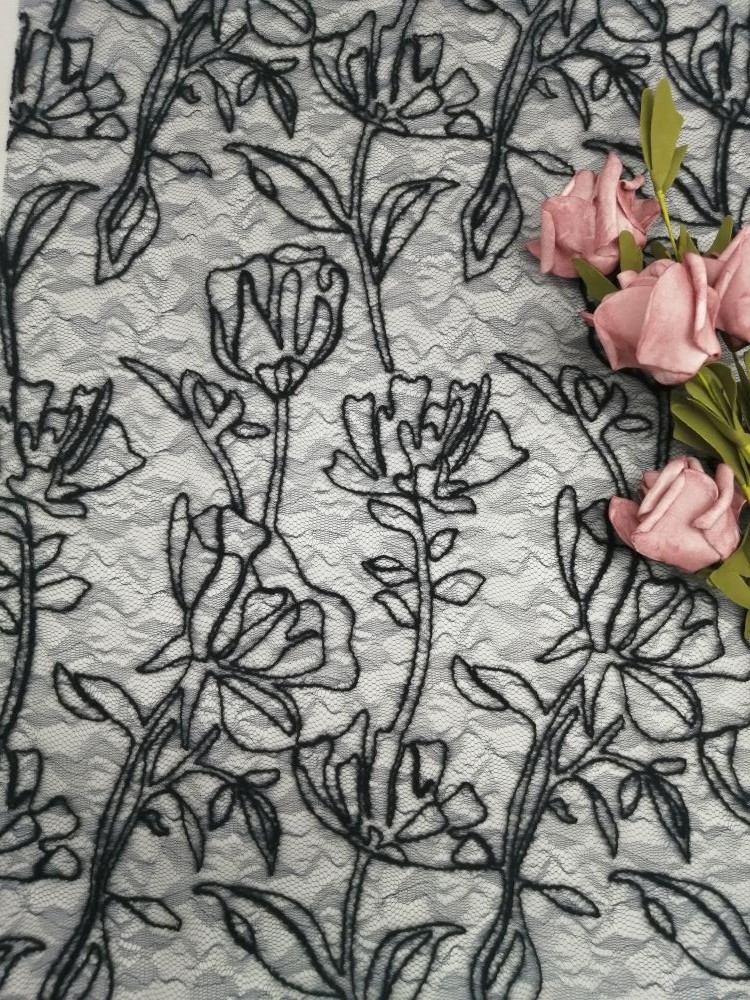 코드화된 검은 과장 3D 꽃 레이스천 꽃 얇은 명주 그물 메쉬 상술 :