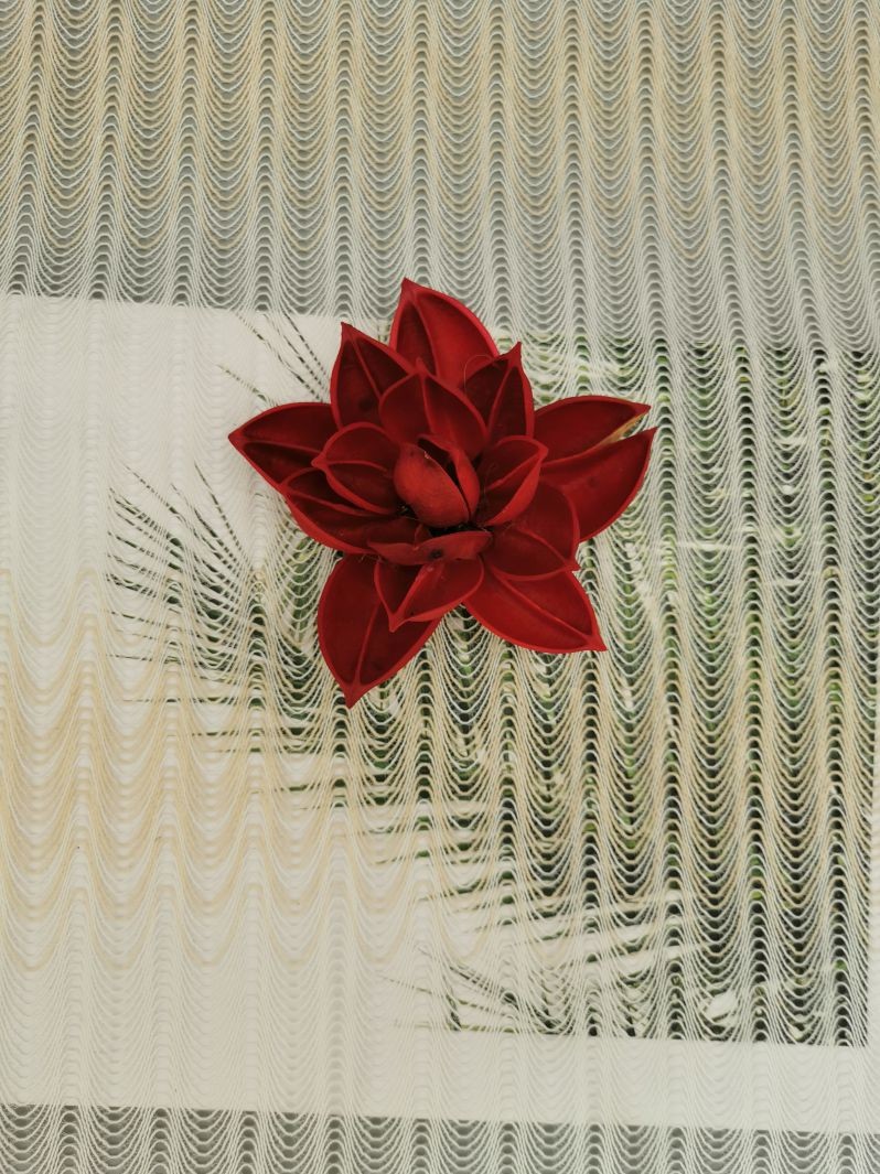 A. 레이스천, 끈 정비, 자수 원단, 얇은 명주 그물 망조직, 얇은 명주 그물 포일 구성, 얇은 명주 그물 프린팅 구성, 얇은 명주 그물 플로킹 구성, 얇은 명주 그물 번쩍이는 금속 조각 구성.