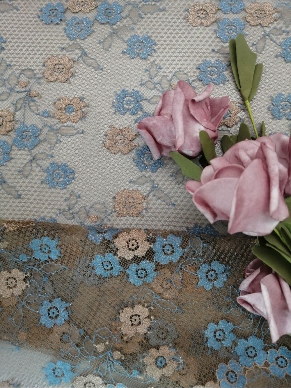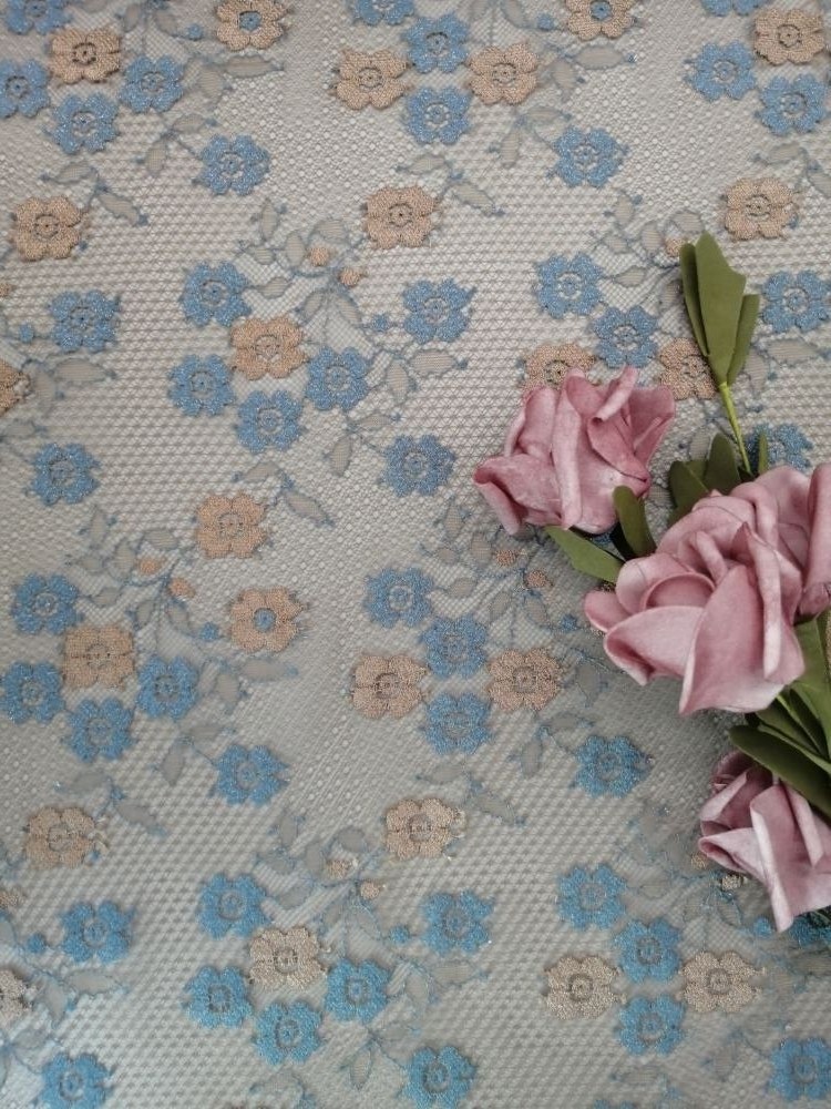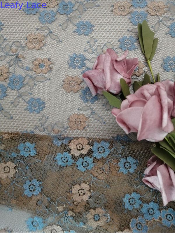 이것꽃 자수 레이스 원단30% 고품질 폴리에스터 및 70% 고품질 나일론으로 만들어집니다.이 레이스를 Acid & Disperse Dyes로 투톤으로 염색합니다.나일론 의 경우 갈색 , 폴리에스터 의 경우 옅은 파란색 입니다 .그것은 아름답고 세련된 패턴을 만듭니다.이 슈퍼 밝은레이디 드레스 레이스 통기성이 좋다.