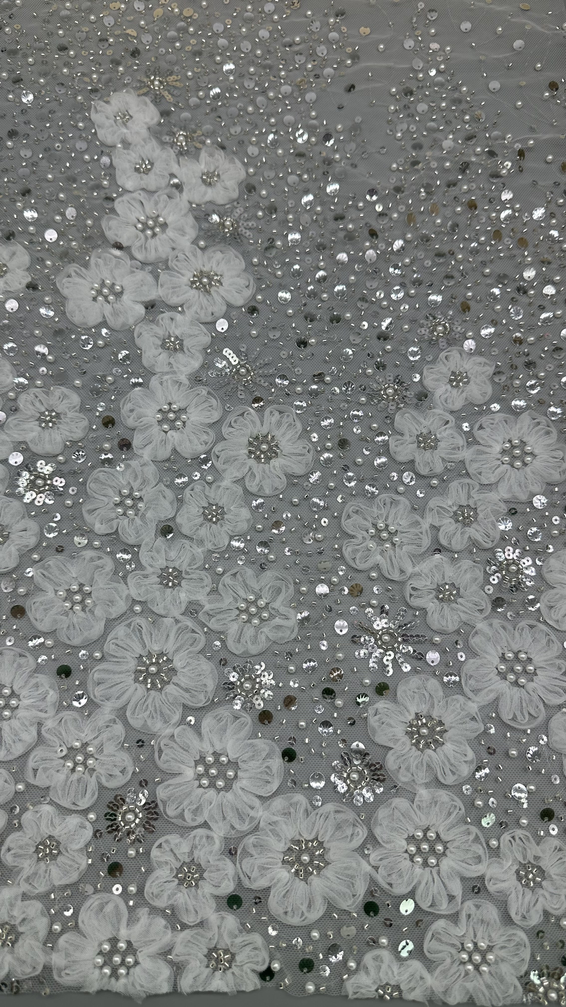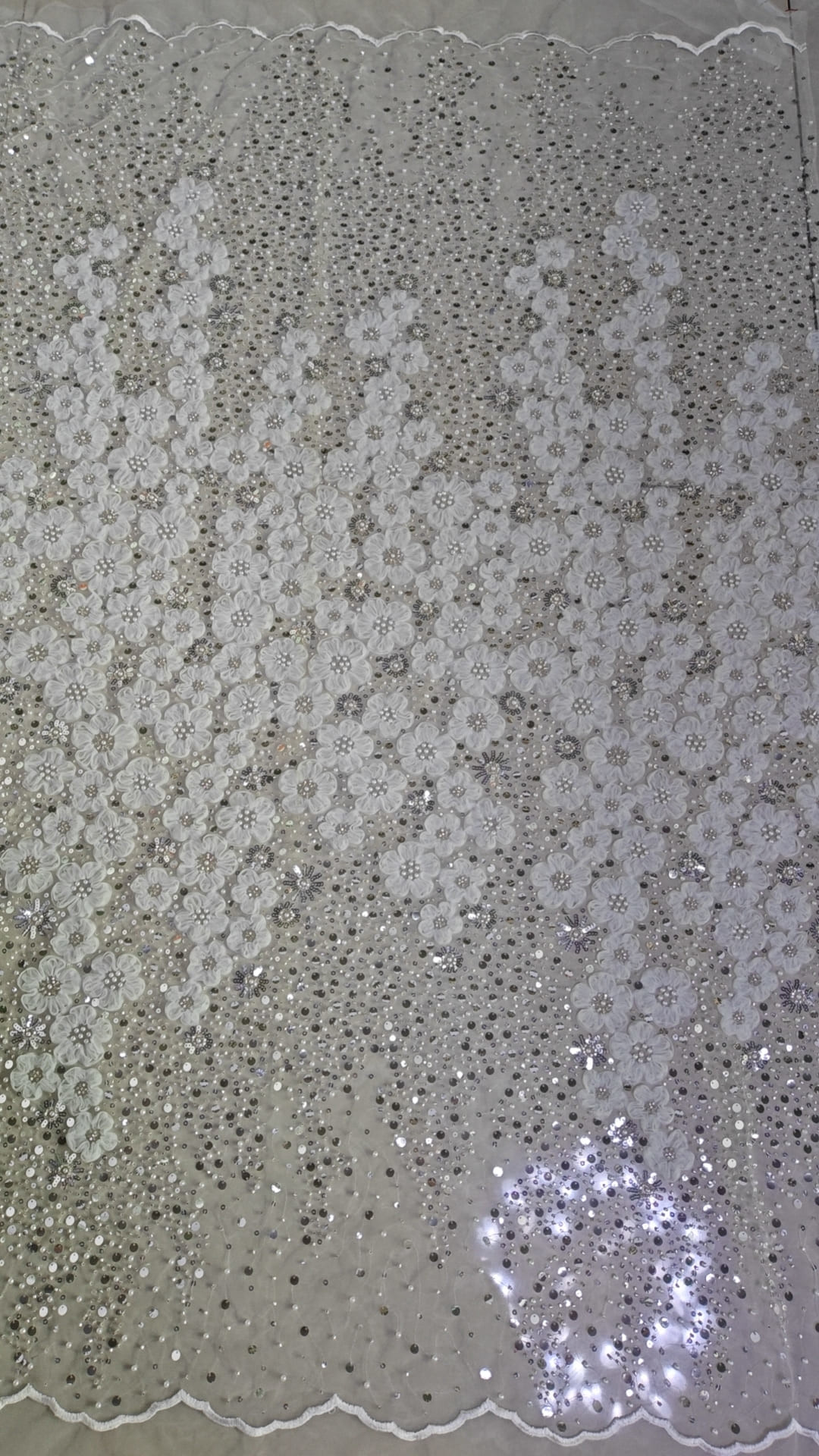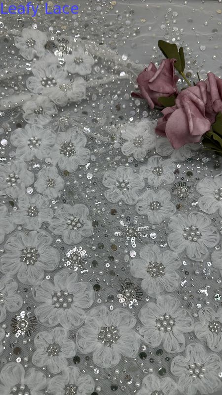 강조하다: | 쉐이크인 蕾丝 珠珠 embroidery fabric,내구성 있는 수직 직물,흰색 진주로 수직된 직물 |