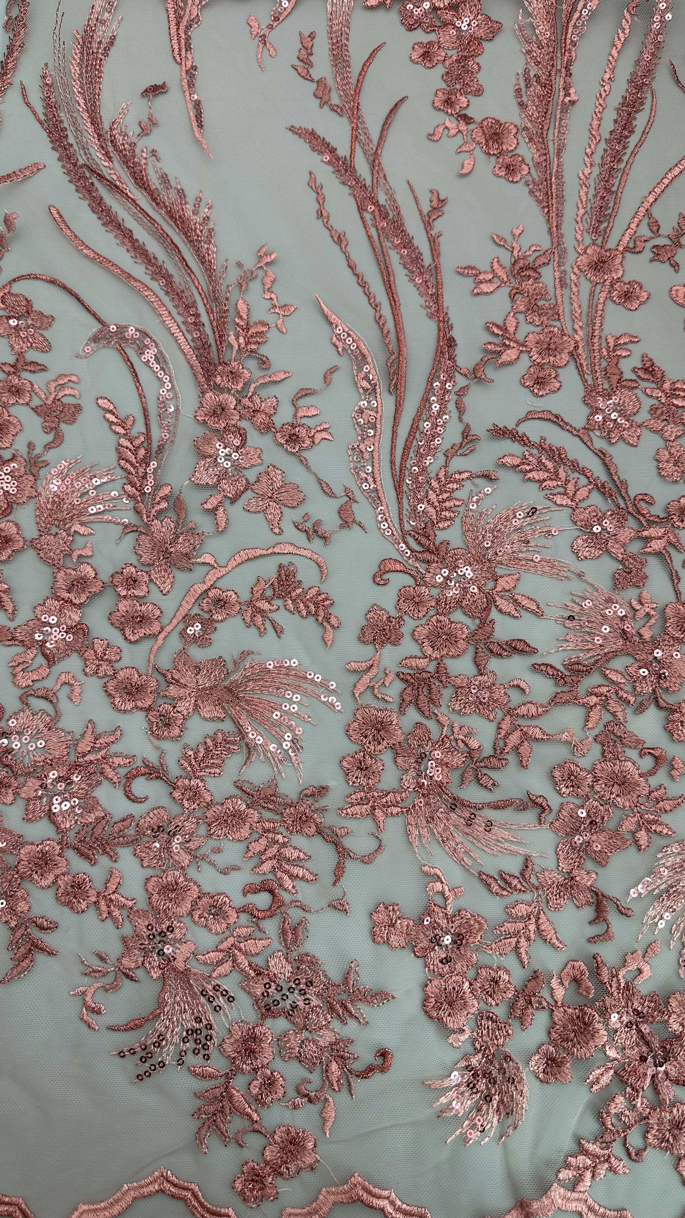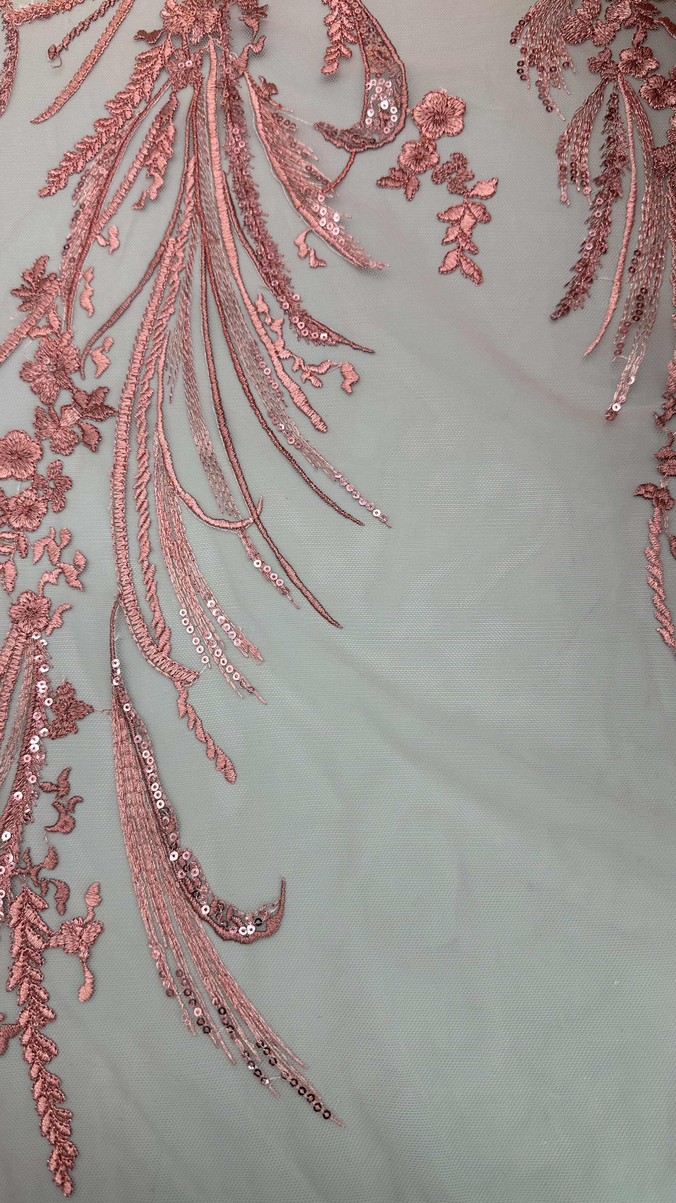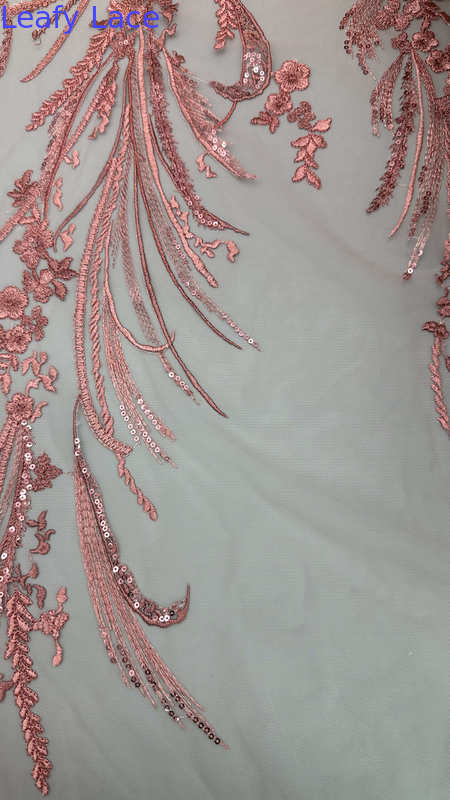 섬세한 잎사귀 모티프가 있는 레이스 자수 원단은 우아함, 질감, 정교한 디테일을 제공하여 웨딩 및 파티 드레스에 인기 있는 선택입니다. 생산 기술은 전통적인 장인 정신과 현대적인 섬유 혁신의 조화를 포함합니다.