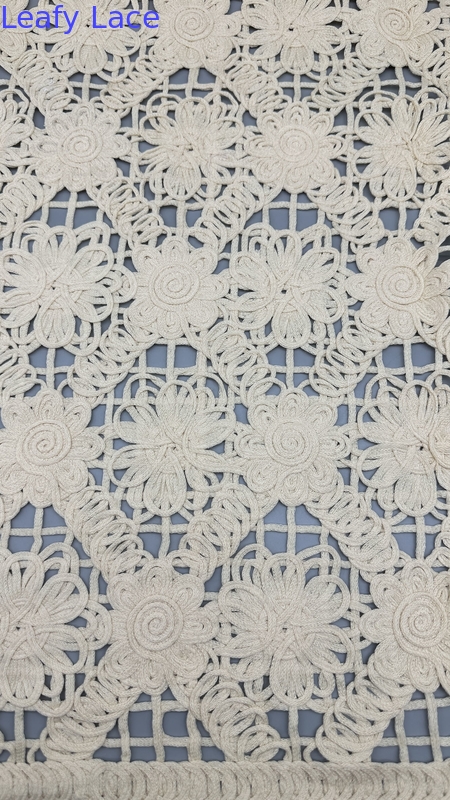 섬세한 잎 모티프가 있는 레이스 자수 원단은 우아함, 질감, 정교한 디테일을 제공하여 웨딩 및 파티 드레스에 인기 있는 선택입니다. 생산 기술은 전통적인 장인 정신과 현대적인 섬유 혁신의 조화를 포함합니다.