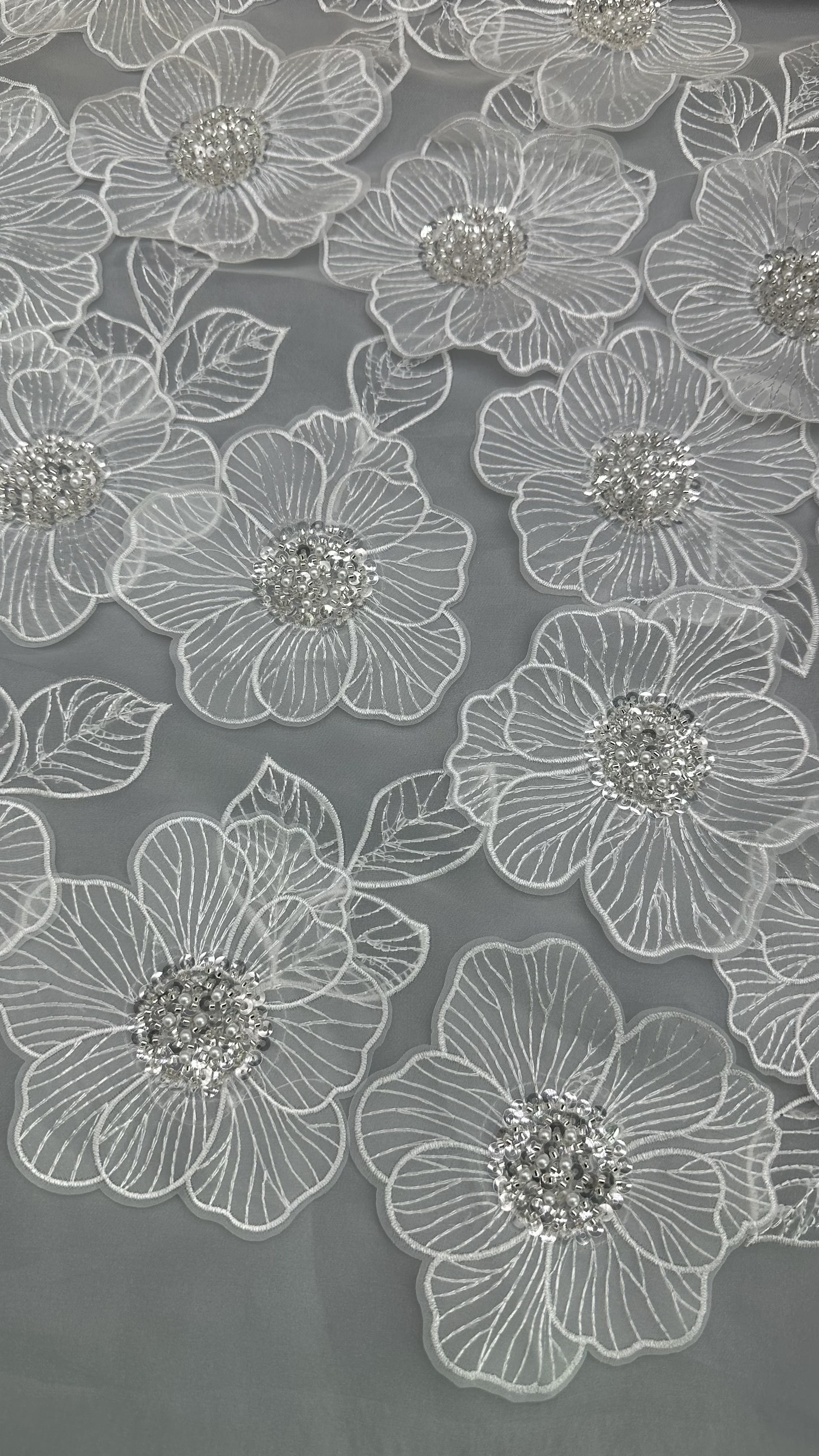 섬세한 잎모티브가 있는 蕾丝 수염 천은 결혼식 드레스와 파티 드레스를 입는 데 인기 있는 선택이며, 우아함과 질감과 복잡한 세부사항을 제공합니다.그 생산 의 기술 은 전통 공예 기술 과 현대 의 섬유 혁신 의 혼합 을 포함 합니다.