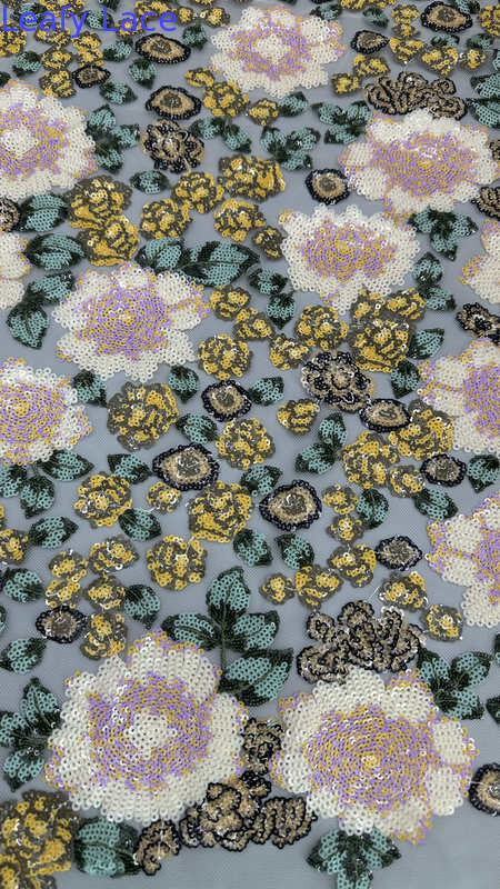 섬세한 잎 모티프가 있는 레이스 자수 원단은 우아함, 질감, 정교한 디테일을 제공하여 웨딩 및 파티 드레스에 인기 있는 선택입니다. 생산 기술은 전통적인 장인 정신과 현대적인 섬유 혁신의 조화를 포함합니다.