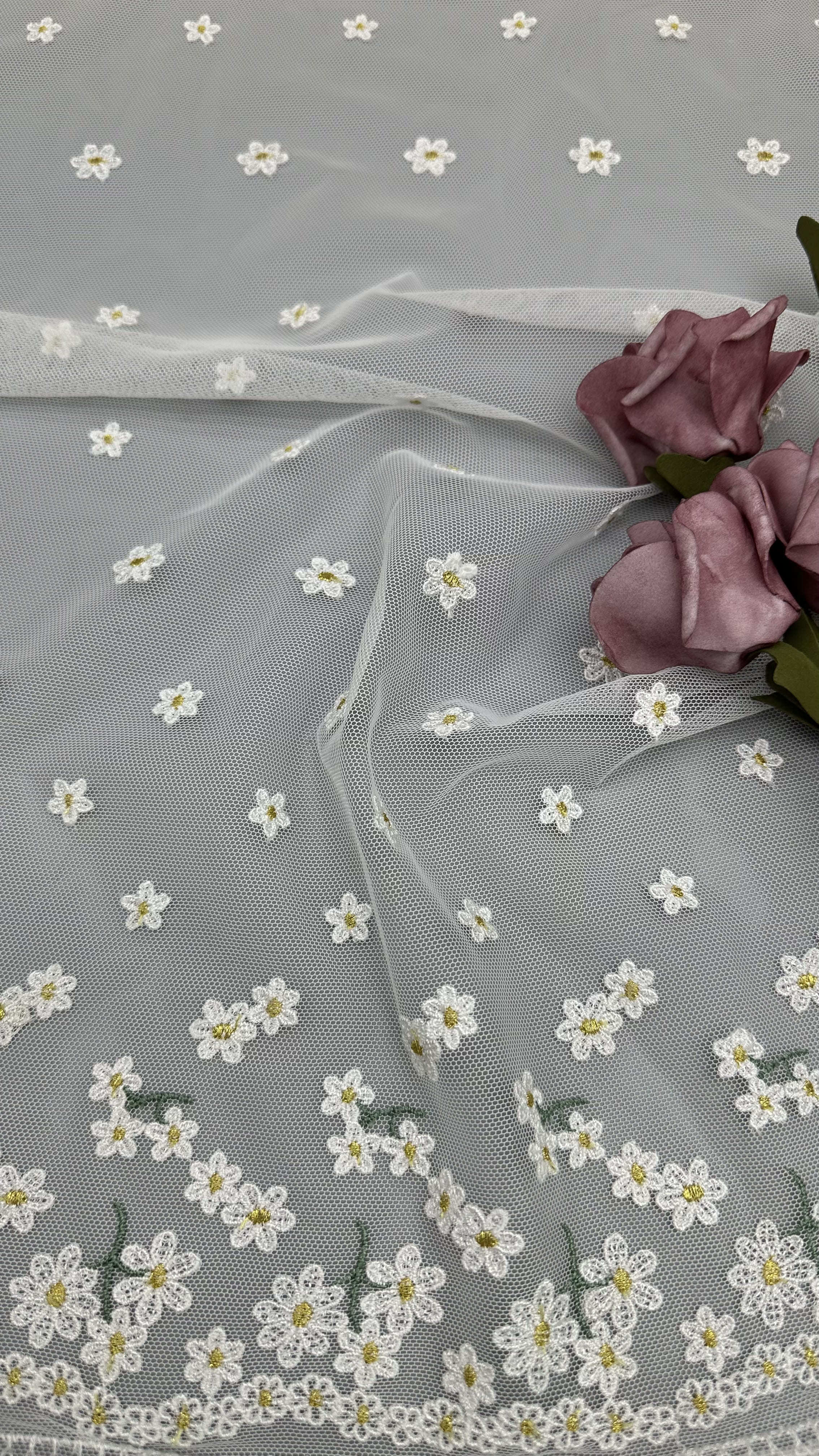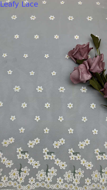 섬세한 잎 모티프가 있는 레이스 자수 원단은 우아함, 질감, 복잡한 디테일을 제공하여 웨딩 및 파티 드레스에 인기 있는 선택입니다. 생산 기술은 전통적인 장인 정신과 현대적인 섬유 혁신의 조화를 포함합니다.
