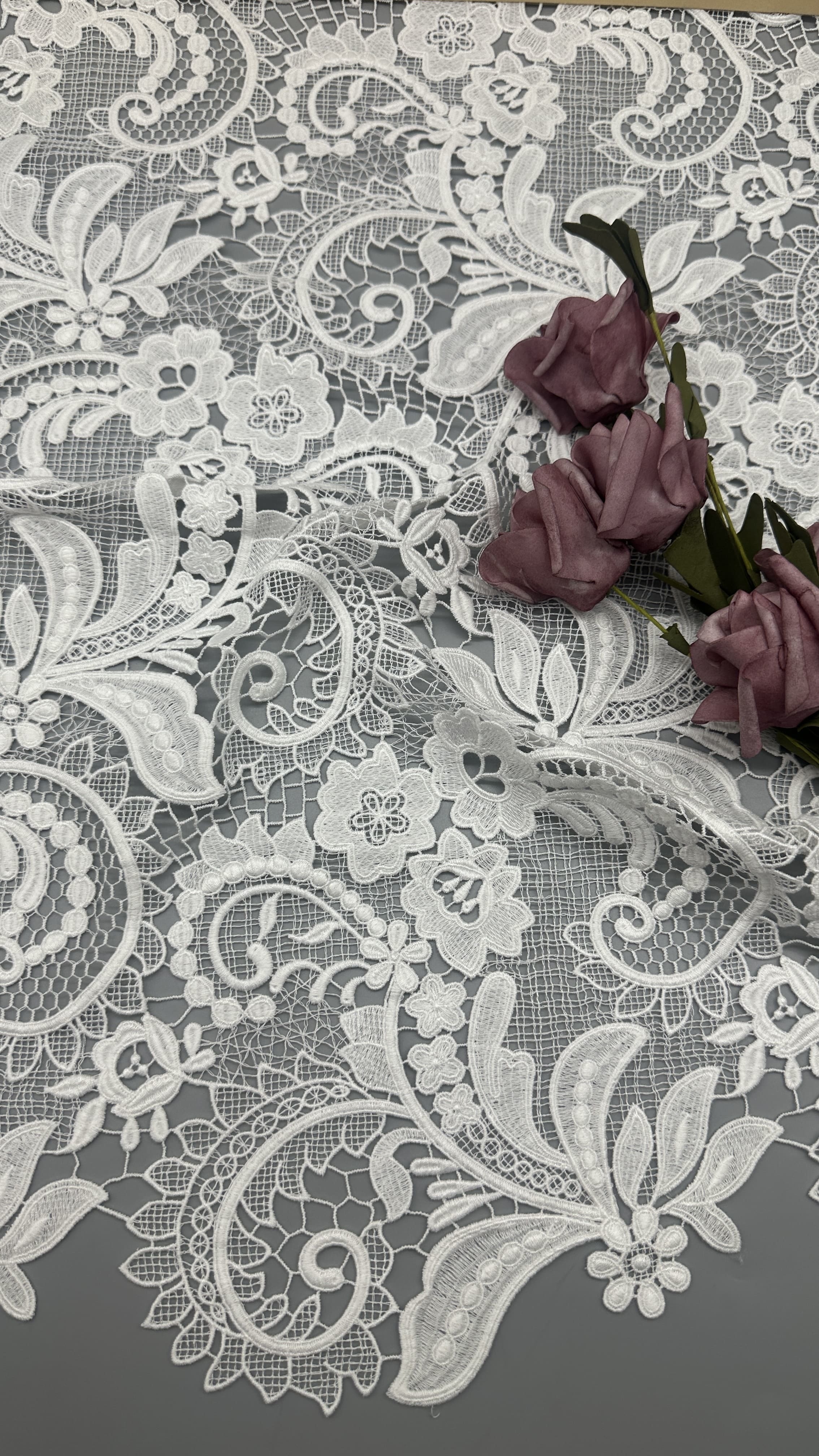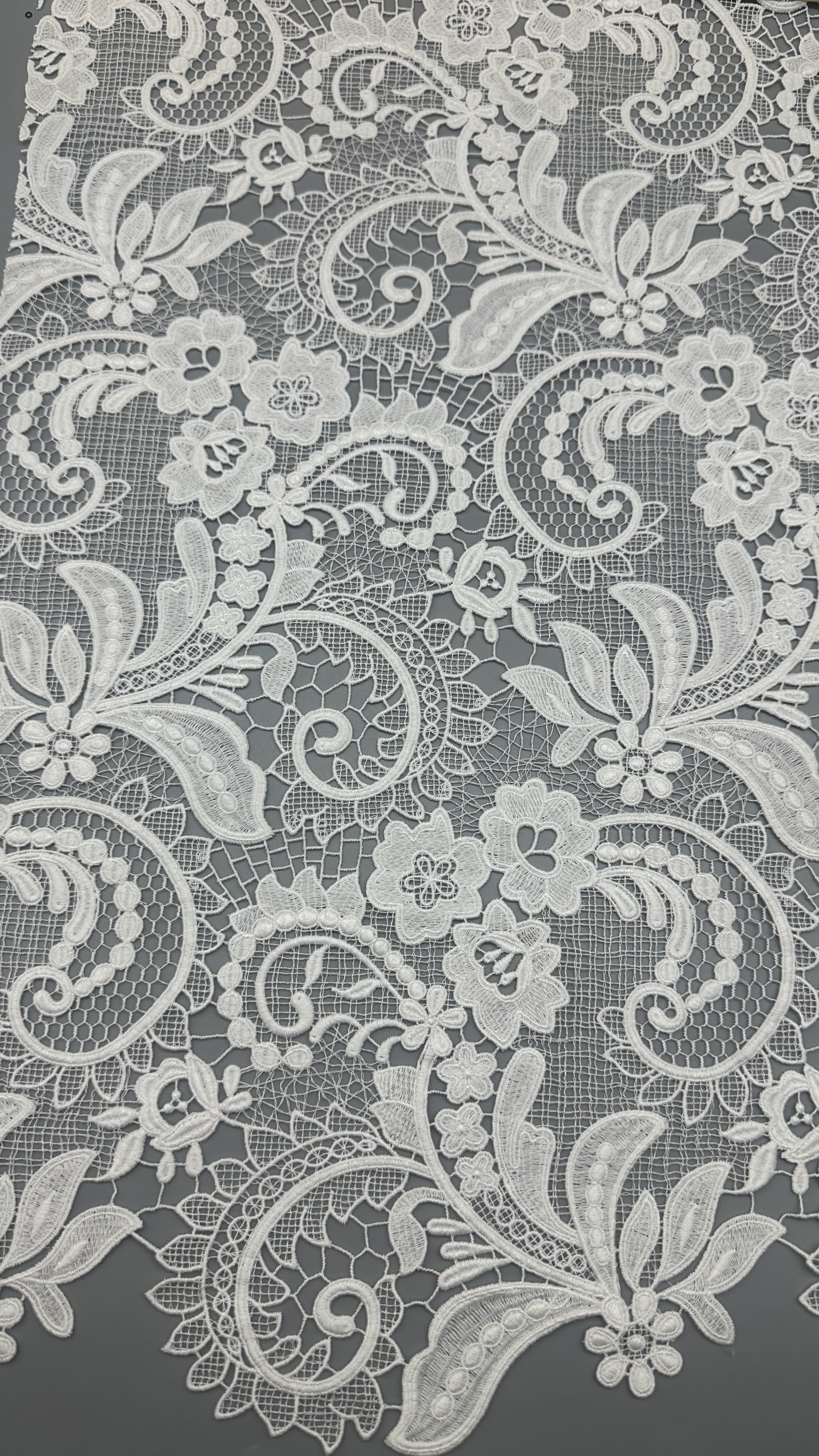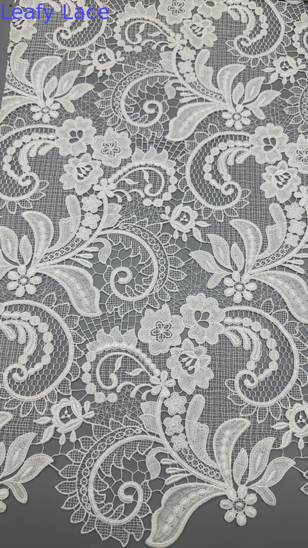 섬세한 잎모티브가 있는 蕾丝 수염 천은 결혼식 드레스와 파티 드레스를 입는 데 인기 있는 선택이며, 우아함과 질감과 복잡한 세부사항을 제공합니다.그 생산 의 기술 은 전통 공예 기술 과 현대 의 섬유 혁신 의 혼합 을 포함 합니다.
