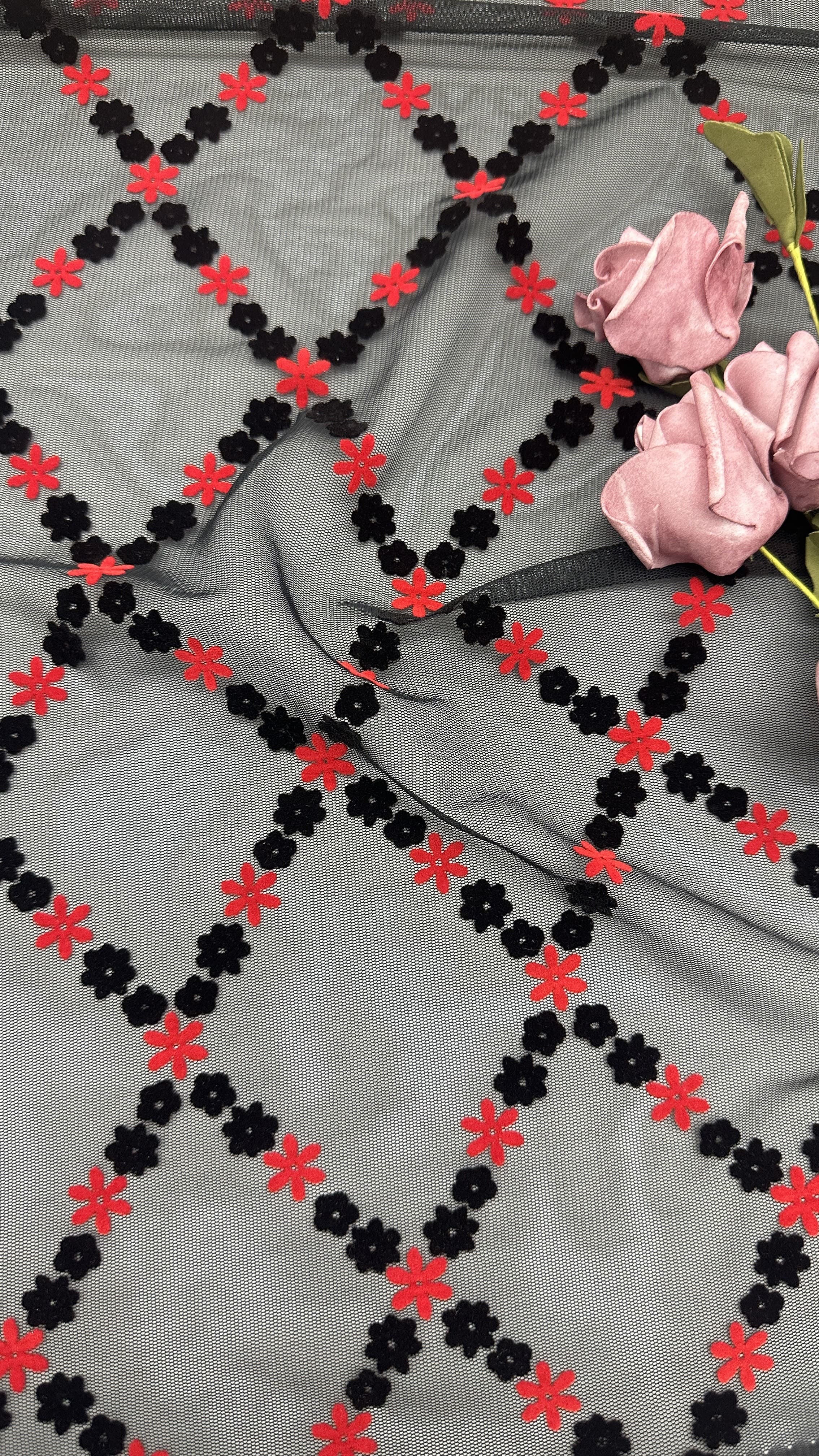 | 강조하다: | small flower flocked mesh fabric,rose black lace fabric,customized gown flocked mesh |